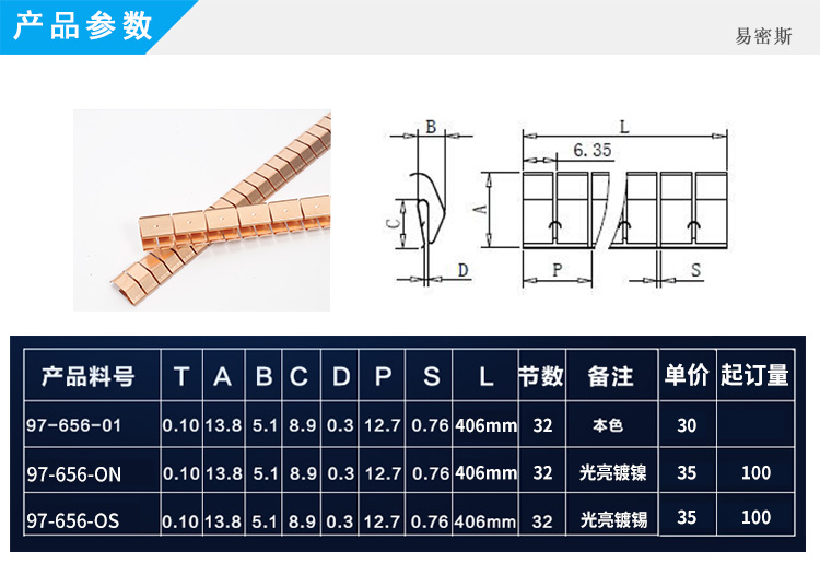 易密斯™鈹銅簧片是用特殊合金鈹銅制成的指形簧片,使高等級EMI屏蔽效果和彈性鉤爪擦與小封閉力特性相結合。鈹銅的高性能參數:拉伸強度高、防腐性能好和導電性能佳,使得它成為一種用在寬頻段的理想EMI屏蔽材料。鈹銅簧片能在多種環境中良好工作,能選擇多種鍍層來確保與其他接觸表面的電化學兼容性,它不會燃燒,也不會受射線或紫外線的影響。由于這些原因,可用在存在EMI/RFI或者ESD問題的范圍很廣的電子設備中,用于各種屏蔽室、艙門、機箱門、蓋板、印刷板插板、集成電路屏蔽等。在計算中心機、軍用導航系統接收機和其它電子設備中都使用鈹銅彈片來進行EMI屏蔽。 易密斯™鈹銅簧片現有60余款標準件可供選擇,同時可支持定制。