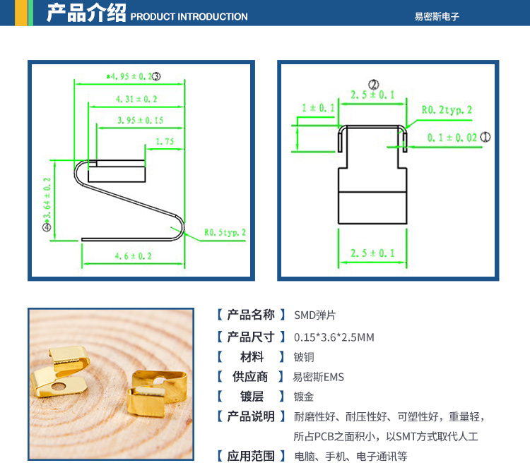 EMS易密斯,2009年創立于昆山,主要產品為EMI鈹銅簧片、不銹鋼彈片、導電泡棉和其他配套電子材料,是目前華東最具規模、產品最齊全的民用電子設備EMI電磁干擾屏蔽材料解決方案提供商。