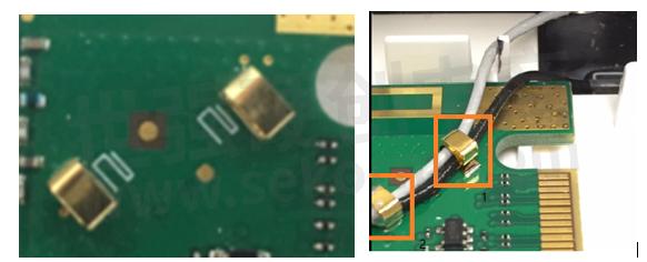 為了提高915M Sub-1GHz無線通信性能,對(duì)天線的走線和接地進(jìn)行了改善,使用易密斯的SMD接地彈片SMD-M-01302520對(duì)外置天線走線進(jìn)行安裝固定和接地,如圖2所示,左圖為SMD 彈片在PCB上的位置,右圖將天線按一定的走線安裝在SMD接地彈片里。首先鍍金彈片對(duì)天線的走線起固定安裝作用,其次,將天線露銅的地方卡進(jìn)鍍金彈片,然后進(jìn)行焊接,對(duì)天線進(jìn)行接地處理。注意,天線剝線接地的地方需要控制好長度。設(shè)計(jì)時(shí)PCB板需要根據(jù)鍍金彈片的PAD大小進(jìn)行開窗露銅處理。