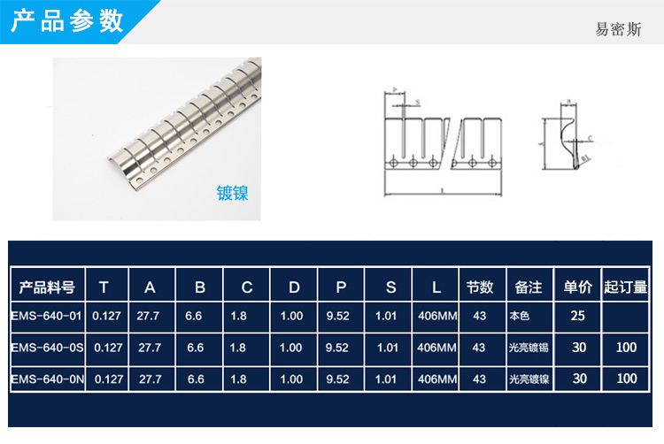 EMS易密斯,2009年創立于昆山,主要產品為EMI鈹銅簧片、不銹鋼彈片、導電泡棉和其他配套電子材料,是目前華東最具規模、產品最齊全的民用電子設備EMI電磁干擾屏蔽材料解決方案提供商。