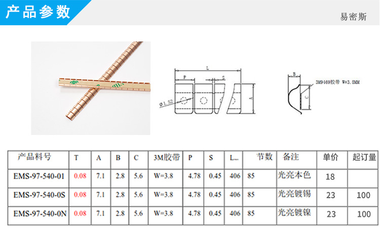 EMS易密斯,2009年創立于昆山,主要產品為EMI鈹銅簧片、不銹鋼彈片、導電泡棉和其他配套電子材料,是目前華東最具規模、產品最齊全的民用電子設備EMI電磁干擾屏蔽材料解決方案提供商。