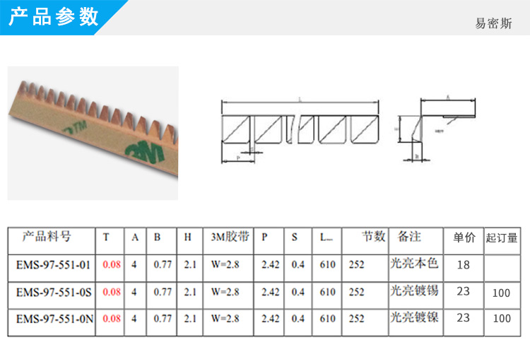 EMS易密斯,2009年創立于昆山,主要產品為EMI鈹銅簧片、不銹鋼彈片、導電泡棉和其他配套電子材料,是目前華東最具規模、產品最齊全的民用電子設備EMI電磁干擾屏蔽材料解決方案提供商。