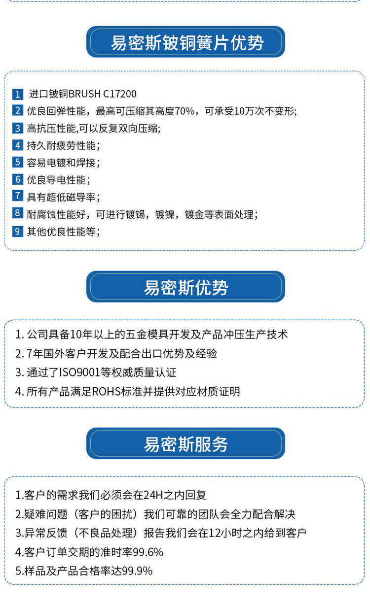 所以,要想選擇好的金屬簧片廠家,還請認準[易密斯]鈹銅簧片,10年以上生產經驗,60%市場占有率,1對1定制生產方案與及時的售后服務,讓用戶金屬簧片買的放心,用得稱心。易密斯屏蔽簧片專心專注,只為提升客戶生產工藝。