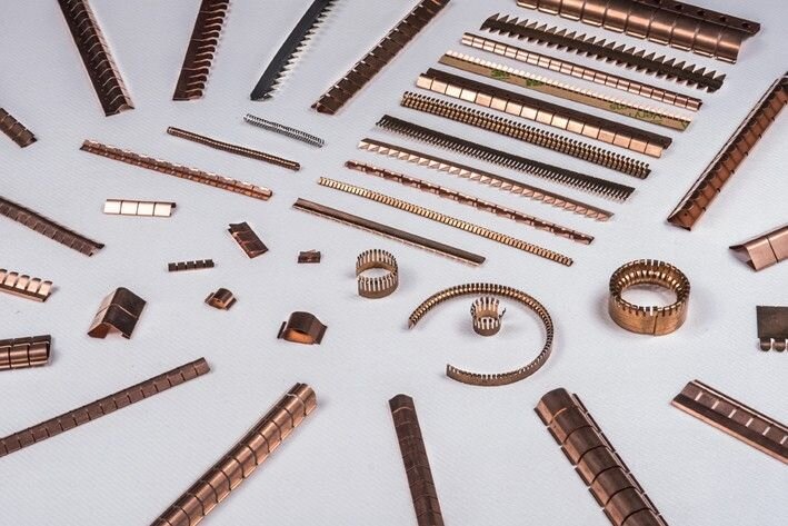 目前應(yīng)用廣泛的簧片基本由鈹銅精制而成,另外也有一些使用不銹鋼作為原料的,相較而言,不銹鋼簧片在保證電連接的可靠上遠(yuǎn)遠(yuǎn)低于鈹銅簧片。鈹銅本身具有的機(jī)械性能不僅容易制造出更多的形狀,以配合不同的使用要求和安裝方式,更重要的是在外力釋放后,鈹銅簧片表現(xiàn)出來的優(yōu)越恢復(fù)能力,可以滿足頻繁啟合柜門等運(yùn)動(dòng)部件電連接的應(yīng)用要求,由特殊合金鈹銅制成的簧片,能夠解決其它襯墊不能在剪切方向的受力問題,同時(shí)具有接合壓力小,形變范圍大,低頻段和高頻段屏蔽性能優(yōu)異,重量輕,安裝方式靈活等種種優(yōu)點(diǎn)。